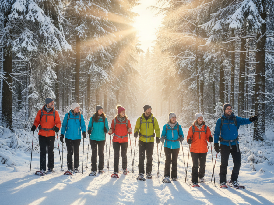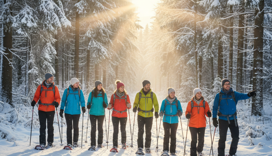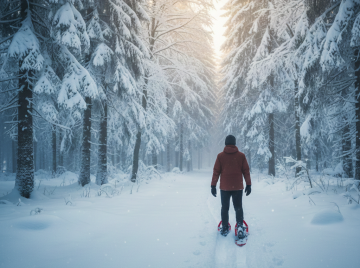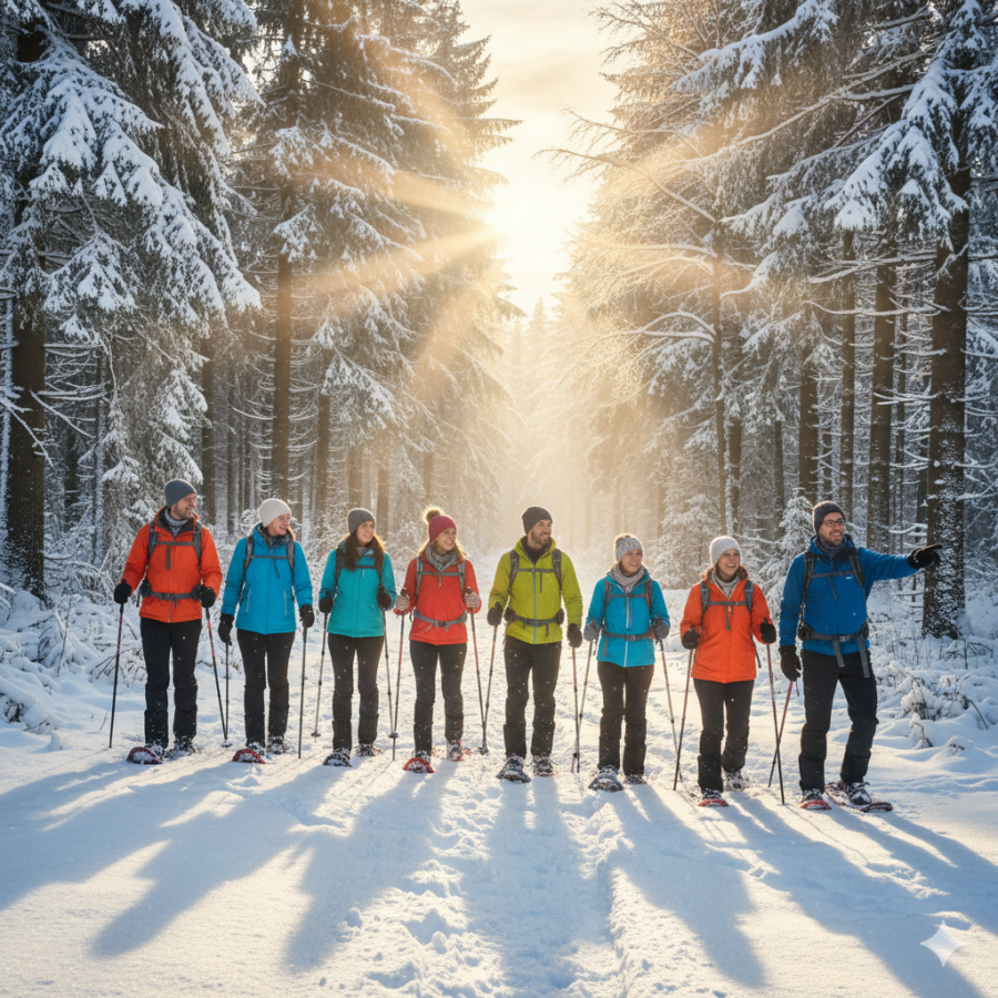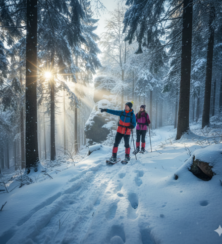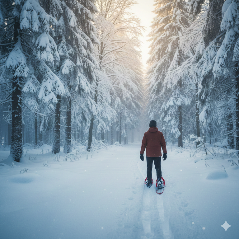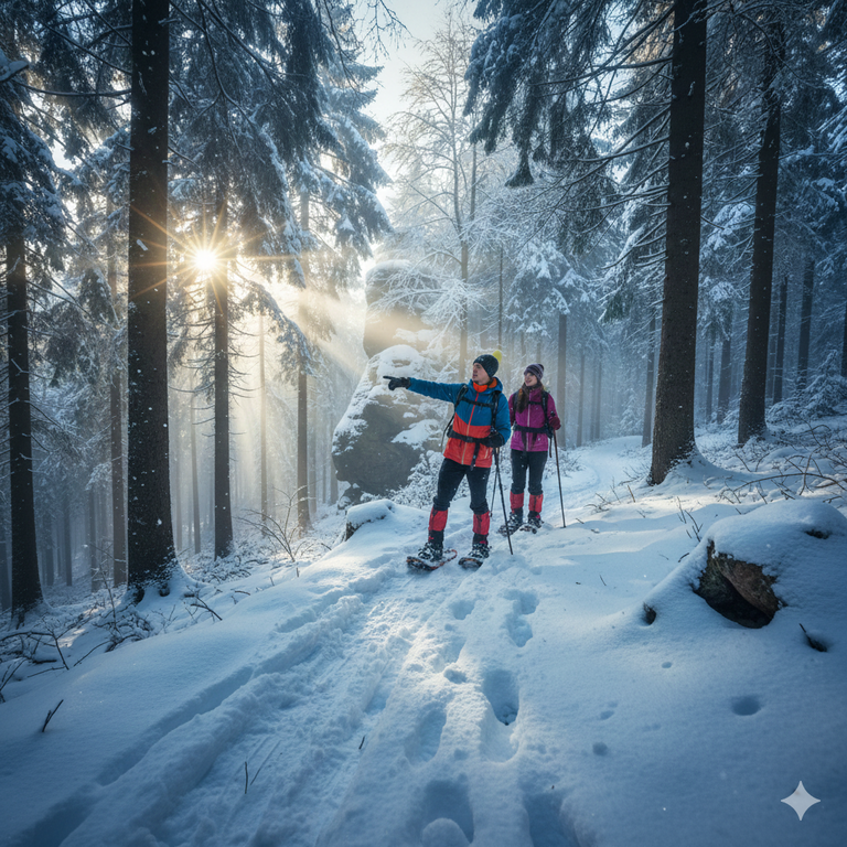 "Entdecken Sie die gesundheitsfördernde Stille des Vogelsbergs. Schneeschuhwandern: Sanft zu den Gelenken, stark für die Seele."